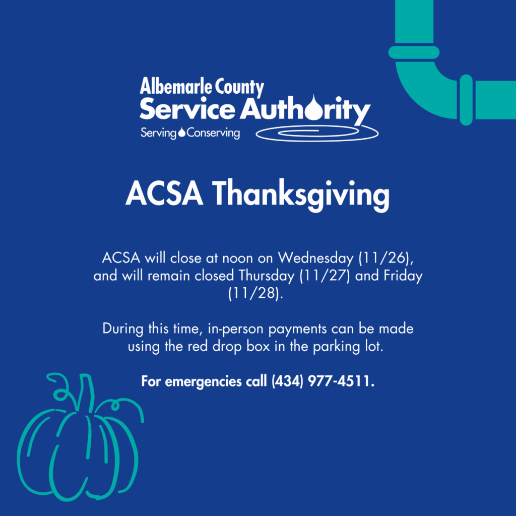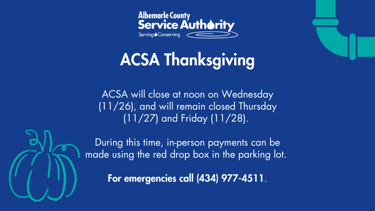 Albemarle County Service Authority will close at noon on Wednesday (11/26), and will remain closed Thursday (11/27) and Friday (11/28). During this time, in-person payments can be made using the red drop box in the parking lot. For emergencies call (434) 977-4511.