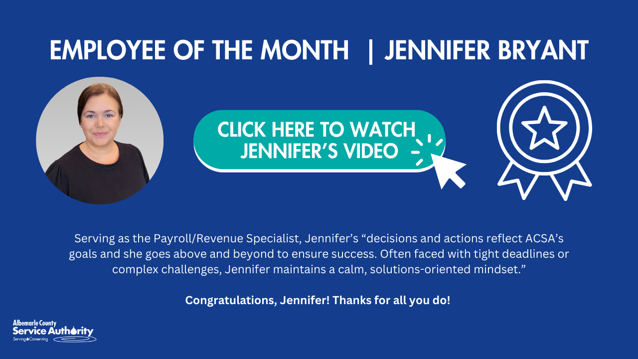 ¡Únase a nosotros para felicitar a nuestra última empleada del mes, Jennifer Bryant! Como especialista en nóminas e ingresos, las decisiones y acciones de Jennifer reflejan los objetivos de ACSA y ella va más allá para garantizar el éxito. A menudo se enfrenta a plazos ajustados o retos complejos, pero Jennifer mantiene una mentalidad tranquila y orientada a las soluciones. Vea su video a continuación: